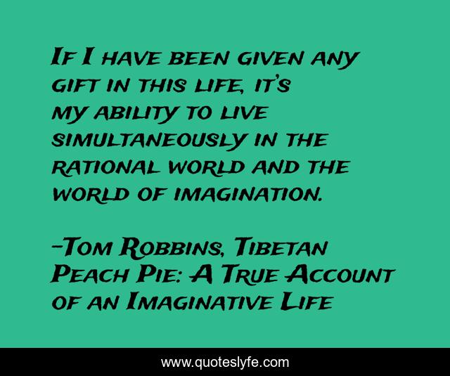 This page presents the quote "If I have been given any gift in this life, it’s my ability to live simultaneously in the rational world and the world of imagination.". Author of this quote is Tom Robbins, Tibetan Peach Pie: A True Account of an Imaginative Life. This quote is about imagination, memoir, inspirational, enthusiasm,.