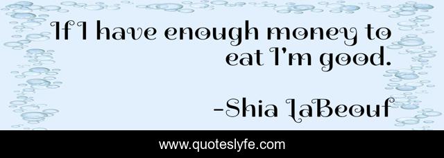 This page presents the quote "If I have enough money to eat I'm good.". Author of this quote is Shia LaBeouf. This quote is about enough, good, eat,.