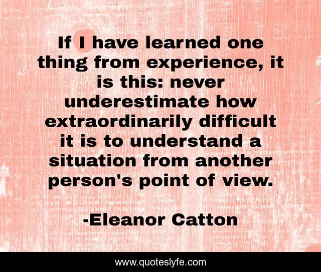 This page presents the quote "If I have learned one thing from experience, it is this: never underestimate how extraordinarily difficult it is to understand a situation from another person's point of view.". Author of this quote is Eleanor Catton. This quote is about relationships, mutual-understanding, experience,.