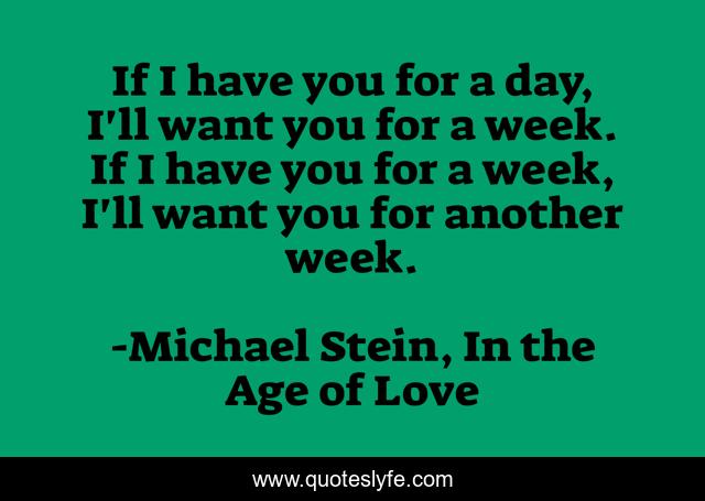 This page presents the quote "If I have you for a day, I'll want you for a week. If I have you for a week, I'll want you for another week.". Author of this quote is Michael Stein, In the Age of Love. This quote is about desire, love, affection,.