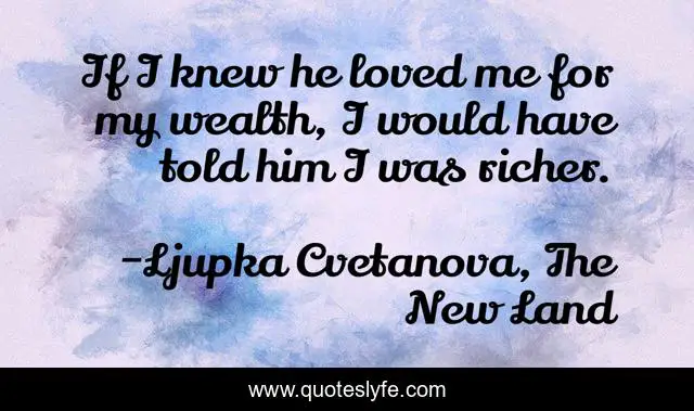 This page presents the quote "If I knew he loved me for my wealth, I would have told him I was richer.". Author of this quote is Ljupka Cvetanova, The New Land. This quote is about woman, love, wealth, richness, aphorisms, affection, man,.