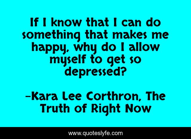 This page presents the quote "If I know that I can do something that makes me happy, why do I allow myself to get so depressed?". Author of this quote is Kara Lee Corthron, The Truth of Right Now. This quote is about depression, happiness, hobbies,.