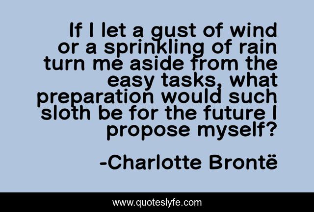 This page presents the quote "If I let a gust of wind or a sprinkling of rain turn me aside from the easy tasks, what preparation would such sloth be for the future I propose myself?". Author of this quote is Charlotte Brontë. This quote is about perseverance, adventure, inspirational, enthusiasm,.