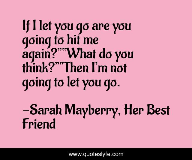 This page presents the quote "If I let you go are you going to hit me again?”“What do you think?”“Then I’m not going to let you go.". Author of this quote is Sarah Mayberry, Her Best Friend. This quote is about romance, funny, comedy, contemporary-romance, humour,.