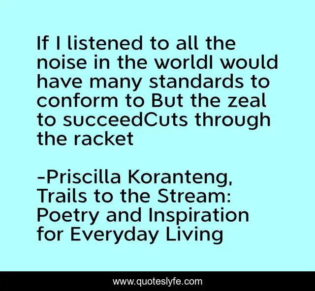 This page presents the quote "If I listened to all the noise in the worldI would have many standards to conform to But the zeal to succeedCuts through the racket". Author of this quote is Priscilla Koranteng, Trails to the Stream: Poetry and Inspiration for Everyday Living. This quote is about success-in-life, success-self-improvement, success-strategies, successful-living, success,.