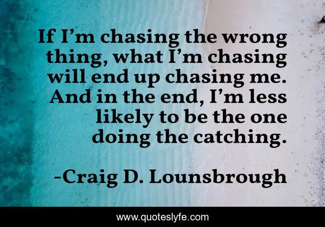 This page presents the quote "If I’m chasing the wrong thing, what I’m chasing will end up chasing me. And in the end, I’m less likely to be the one doing the catching.". Author of this quote is Craig D. Lounsbrough. This quote is about fleeing, catching, decisions, chase, incorrect, goal, destination, chased, priority,.