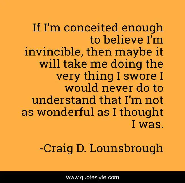 This page presents the quote "If I’m conceited enough to believe I’m invincible, then maybe it will take me doing the very thing I swore I would never do to understand that I’m not as wonderful as I thought I was.". Author of this quote is Craig D. Lounsbrough. This quote is about disappoint, egocentric, boldness, bold, conceit, self-centered, committed, failure, wonderful,.