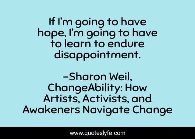 This page presents the quote "If I’m going to have hope, I’m going to have to learn to endure disappointment.". Author of this quote is Sharon Weil, ChangeAbility: How Artists, Activists, and Awakeners Navigate Change. This quote is about motivation, sharon-weil, changeability, change, keep-your-head-up, hopeful, keep-going, dissapointment, endure,.
