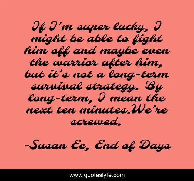 This page presents the quote "If I’m super lucky, I might be able to fight him off and maybe even the warrior after him, but it’s not a long-term survival strategy. By long-term, I mean the next ten minutes.We’re screwed.". Author of this quote is Susan Ee, End of Days. This quote is about survival, penryn,.