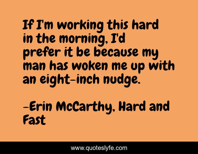 This page presents the quote "If I'm working this hard in the morning, I'd prefer it be because my man has woken me up with an eight-inch nudge.". Author of this quote is Erin McCarthy, Hard and Fast. This quote is about work, erection, morning,.