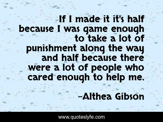This page presents the quote "If I made it it's half because I was game enough to take a lot of punishment along the way and half because there were a lot of people who cared enough to help me.". Author of this quote is Althea Gibson. .
