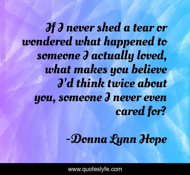 This page presents the quote "If I never shed a tear or wondered what happened to someone I actually loved, what makes you believe I'd think twice about you, someone I never even cared for?". Author of this quote is Donna Lynn Hope. This quote is about relationships, egos, ego, egotistical,.