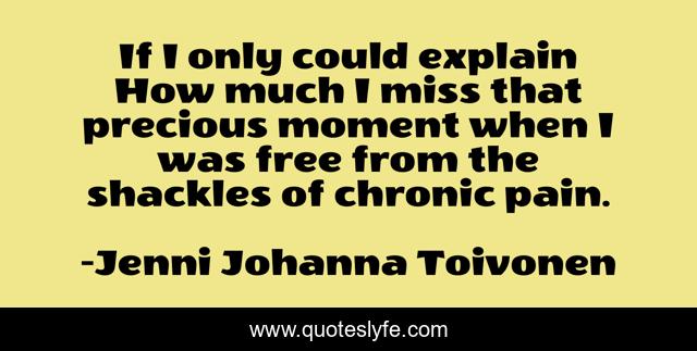 This page presents the quote "If I only could explain How much I miss that precious moment when I was free from the shackles of chronic pain.". Author of this quote is Jenni Johanna Toivonen. This quote is about chronic-pain, words-to-ponder, crps, thoughts-on-life, life-philosophy, chronic-illness,.