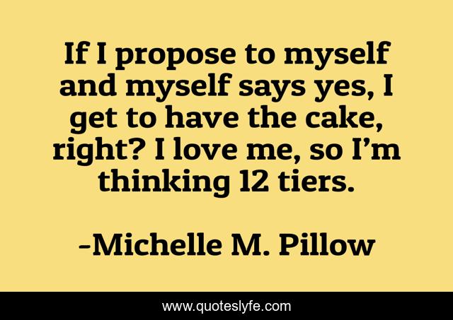This page presents the quote "If I propose to myself and myself says yes, I get to have the cake, right? I love me, so I’m thinking 12 tiers.". Author of this quote is Michelle M. Pillow. This quote is about writing-life, love, author-life, propose, weddings, nonsense, wedding, cake, wedding-cake,.