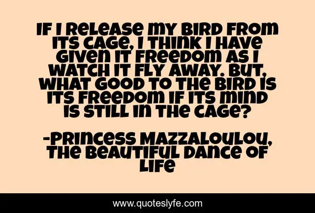 This page presents the quote "If I release my bird from its cage, I think I have given it freedom as I watch it fly away. But, what good to the bird is its freedom if its mind is still in the cage?". Author of this quote is Princess Mazzaloulou, The Beautiful Dance of Life. This quote is about freedom, spirituality,.