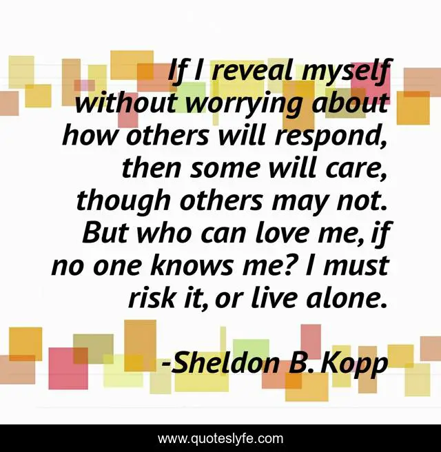 This page presents the quote "If I reveal myself without worrying about how others will respond, then some will care, though others may not. But who can love me, if no one knows me? I must risk it, or live alone.". Author of this quote is Sheldon B. Kopp. This quote is about life, love, knowledge, god, winning, inspirational, enthusiasm, wisdom, hate,.