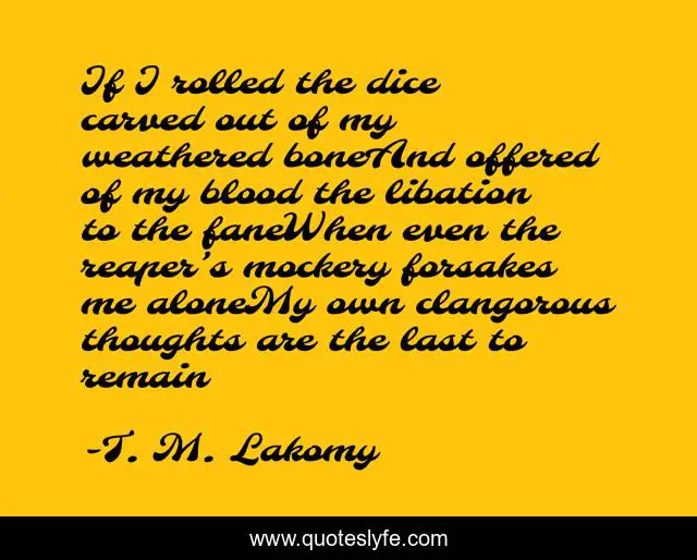 This page presents the quote "If I rolled the dice carved out of my weathered boneAnd offered of my blood the libation to the faneWhen even the reaper’s mockery forsakes me aloneMy own clangorous thoughts are the last to remain". Author of this quote is T. M. Lakomy. This quote is about fantasy, epic-fantasy, dark-fantasy,.