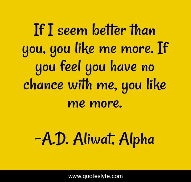 This page presents the quote "If I seem better than you, you like me more. If you feel you have no chance with me, you like me more.". Author of this quote is A.D. Aliwat, Alpha. This quote is about attraction, dating-tips,.