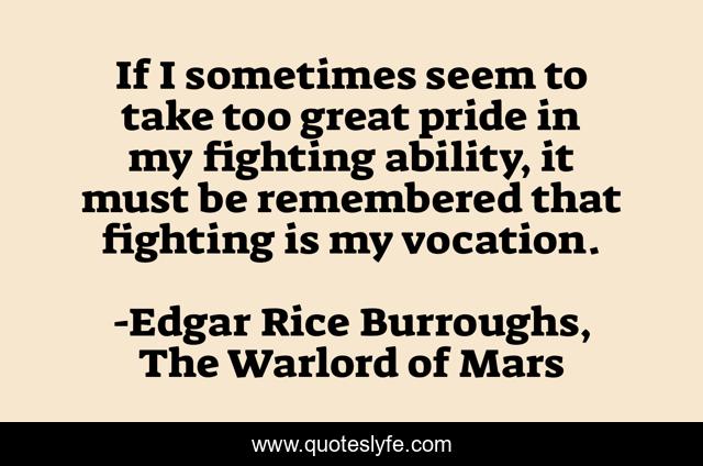 This page presents the quote "If I sometimes seem to take too great pride in my fighting ability, it must be remembered that fighting is my vocation.". Author of this quote is Edgar Rice Burroughs, The Warlord of Mars. This quote is about pride, vocation, fighting,.