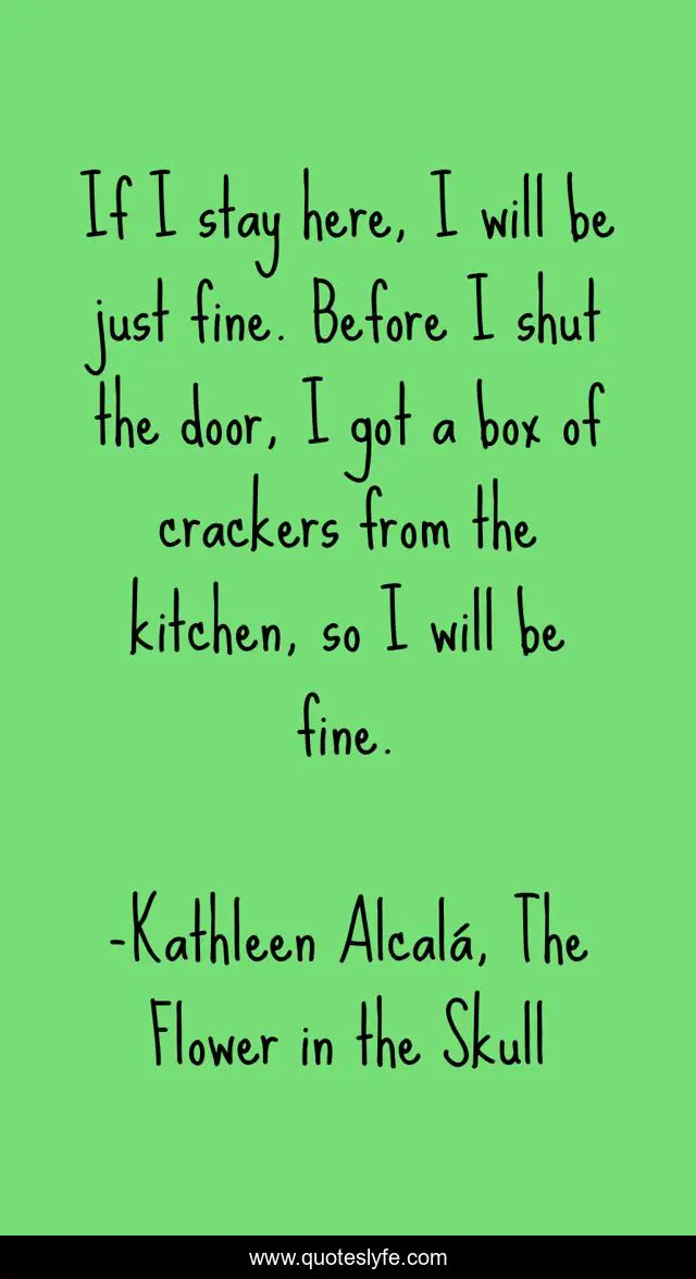 This page presents the quote "If I stay here, I will be just fine. Before I shut the door, I got a box of crackers from the kitchen, so I will be fine.". Author of this quote is Kathleen Alcalá, The Flower in the Skull. This quote is about fear, magical-realism, indigenous-peoples, abuse, southwestern,.