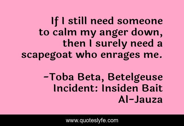 This page presents the quote "If I still need someone to calm my anger down, then I surely need a scapegoat who enrages me.". Author of this quote is Toba Beta, Betelgeuse Incident: Insiden Bait Al-Jauza. This quote is about anger, angry, point-finger, scapegoat, self-control,.