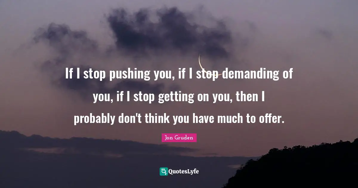 This page presents the quote "If I stop pushing you, if I stop demanding of you, if I stop getting on you, then I probably don't think you have much to offer.". Author of this quote is Jon Gruden. This quote is about pushing, thinking, offers,.