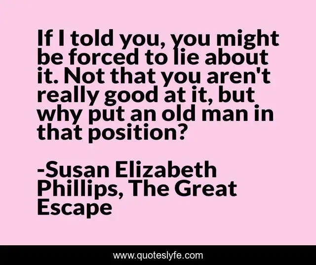 This page presents the quote "If I told you, you might be forced to lie about it. Not that you aren't really good at it, but why put an old man in that position?". Author of this quote is Susan Elizabeth Phillips, The Great Escape. This quote is about lie, old-man, lying,.