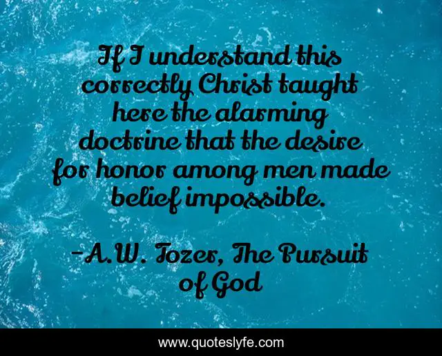 This page presents the quote "If I understand this correctly Christ taught here the alarming doctrine that the desire for honor among men made belief impossible.". Author of this quote is A.W. Tozer, The Pursuit of God. This quote is about pride, belief, honor,.