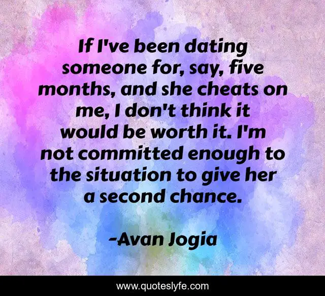 This page presents the quote "If I've been dating someone for, say, five months, and she cheats on me, I don't think it would be worth it. I'm not committed enough to the situation to give her a second chance.". Author of this quote is Avan Jogia. This quote is about me, dating, second chance,.