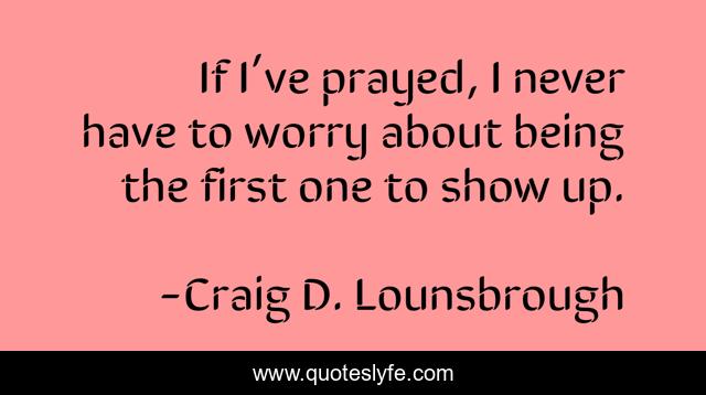 This page presents the quote "If I’ve prayed, I never have to worry about being the first one to show up.". Author of this quote is Craig D. Lounsbrough. This quote is about faith, christian, belief, power, god, jesus, prayer, alone, worry,.
