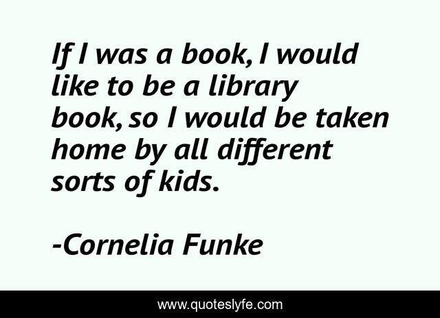 This page presents the quote "If I was a book, I would like to be a library book, so I would be taken home by all different sorts of kids.". Author of this quote is Cornelia Funke. This quote is about book, library, kids,.