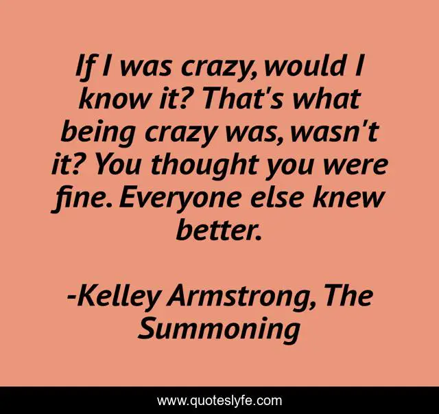 This page presents the quote "If I was crazy, would I know it? That's what being crazy was, wasn't it? You thought you were fine. Everyone else knew better.". Author of this quote is Kelley Armstrong, The Summoning. This quote is about sanity, insanity,.