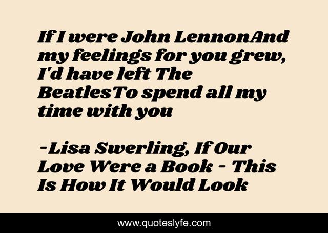 This page presents the quote "If I were John LennonAnd my feelings for you grew, I'd have left The BeatlesTo spend all my time with you". Author of this quote is Lisa Swerling, If Our Love Were a Book - This Is How It Would Look. This quote is about love, john-lennon, romance, poems, the-beatles, affection,.