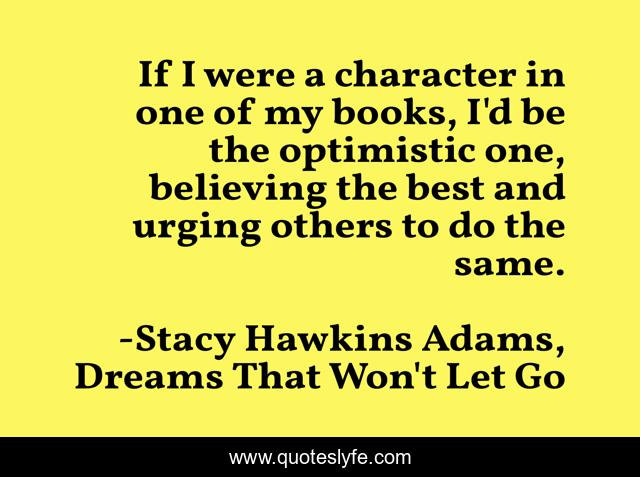 This page presents the quote "If I were a character in one of my books, I'd be the optimistic one, believing the best and urging others to do the same.". Author of this quote is Stacy Hawkins Adams, Dreams That Won't Let Go. This quote is about faith, fiction, hope, inspirational, enthusiasm, women-s-fiction, dreams,.
