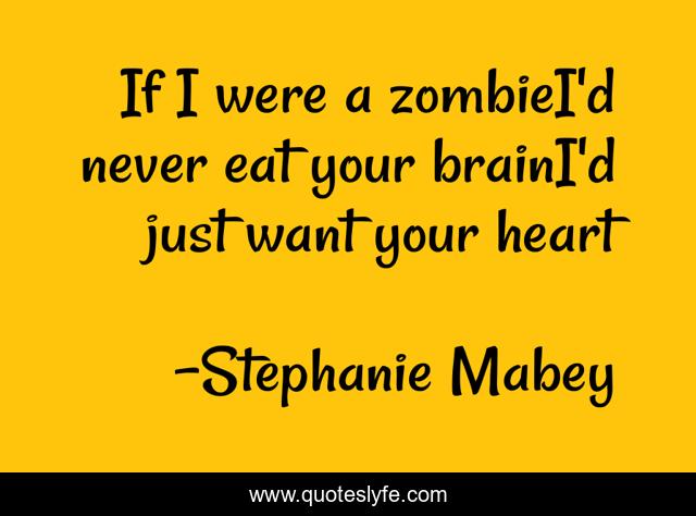 This page presents the quote "If I were a zombieI'd never eat your brainI'd just want your heart". Author of this quote is Stephanie Mabey. This quote is about heart, love, storyteller, zombie, brain, affection,.