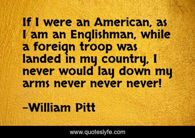 This page presents the quote "If I were an American, as I am an Englishman, while a foreign troop was landed in my country, I never would lay down my arms never never never!". Author of this quote is William Pitt. This quote is about down, american,.