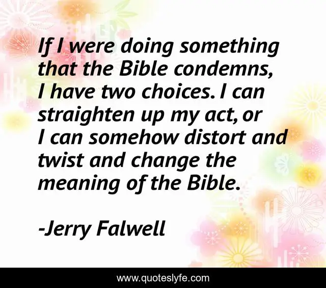 This page presents the quote "If I were doing something that the Bible condemns, I have two choices. I can straighten up my act, or I can somehow distort and twist and change the meaning of the Bible.". Author of this quote is Jerry Falwell. This quote is about meaning, bible, choices,.