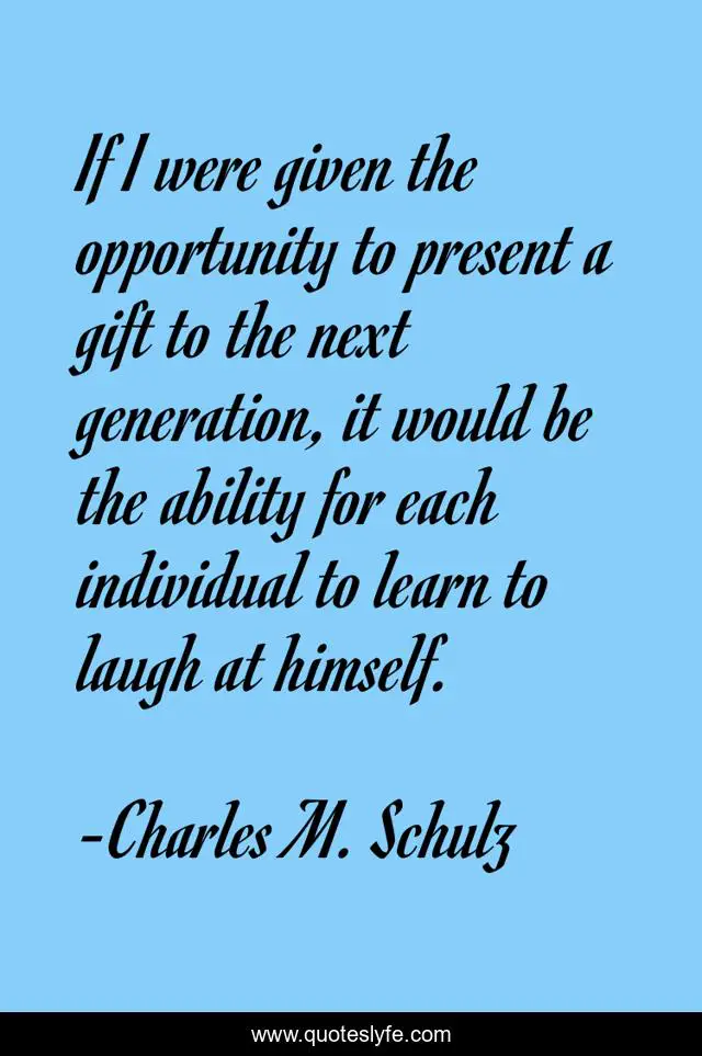 This page presents the quote "If I were given the opportunity to present a gift to the next generation, it would be the ability for each individual to learn to laugh at himself.". Author of this quote is Charles M. Schulz. This quote is about enthusiasm, gift, inspirational, life-lessons,.