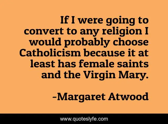 This page presents the quote "If I were going to convert to any religion I would probably choose Catholicism because it at least has female saints and the Virgin Mary.". Author of this quote is Margaret Atwood. This quote is about going, choose, female,.