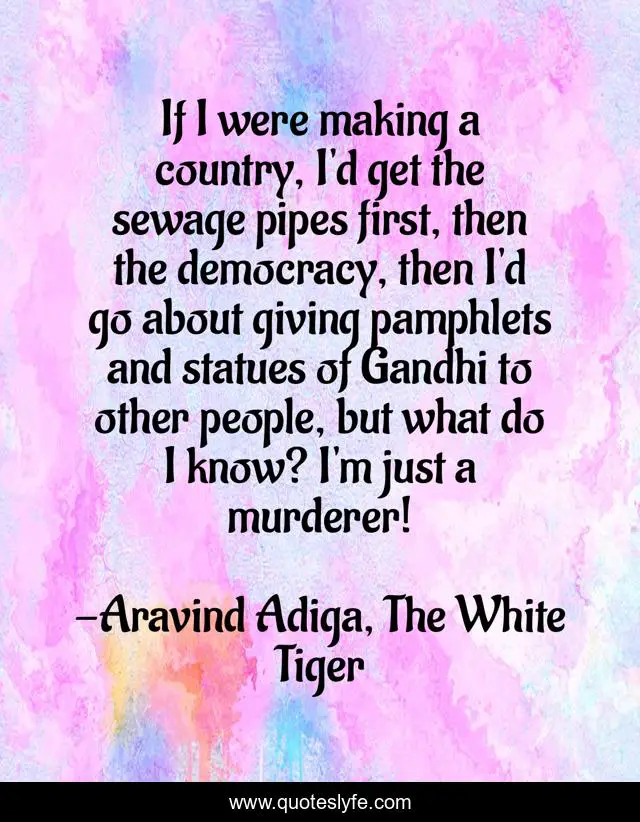 This page presents the quote "If I were making a country, I'd get the sewage pipes first, then the democracy, then I'd go about giving pamphlets and statues of Gandhi to other people, but what do I know? I'm just a murderer!". Author of this quote is Aravind Adiga, The White Tiger. This quote is about pamphlet, murder, gandhi, sewage, democracy,.