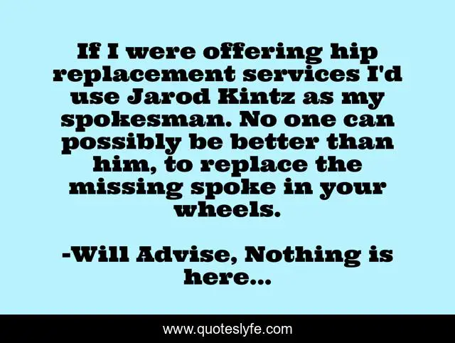 This page presents the quote "If I were offering hip replacement services I'd use Jarod Kintz as my spokesman. No one can possibly be better than him, to replace the missing spoke in your wheels.". Author of this quote is Will Advise, Nothing is here.... This quote is about repair, old, public-speaking, elderly, nothing, bicycle, no-one, repairs, service,.