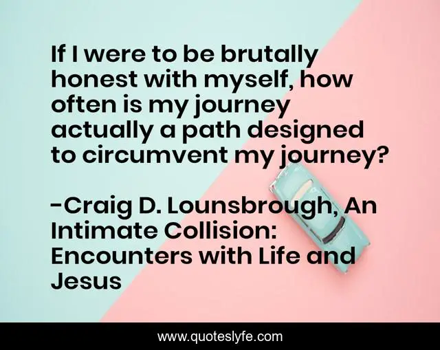 This page presents the quote "If I were to be brutally honest with myself, how often is my journey actually a path designed to circumvent my journey?". Author of this quote is Craig D. Lounsbrough, An Intimate Collision: Encounters with Life and Jesus. This quote is about myself, honesty, self, honest, future, goals, aspirations, path, circumvent,.