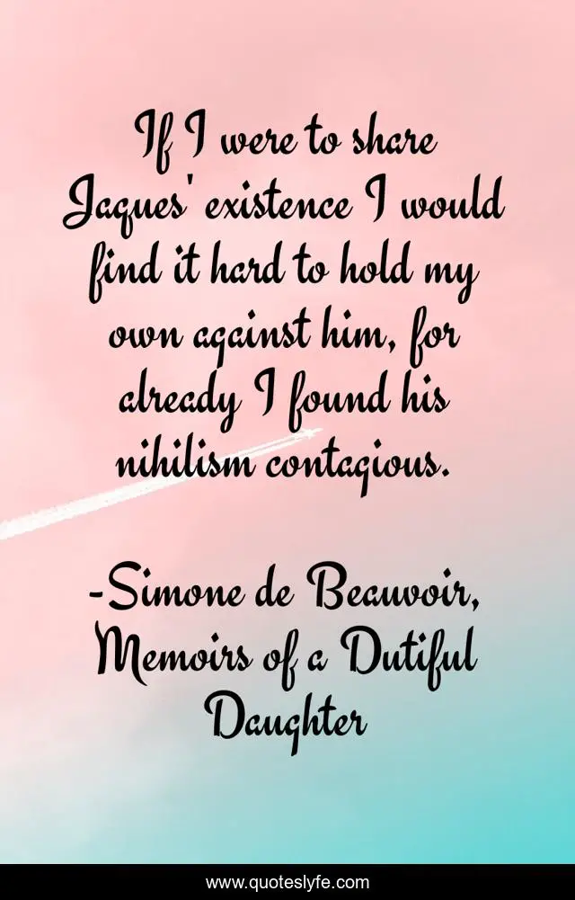 This page presents the quote "If I were to share Jaques' existence I would find it hard to hold my own against him, for already I found his nihilism contagious.". Author of this quote is Simone de Beauvoir, Memoirs of a Dutiful Daughter. This quote is about relationships, lovers, toxic-relationships, nihilism,.
