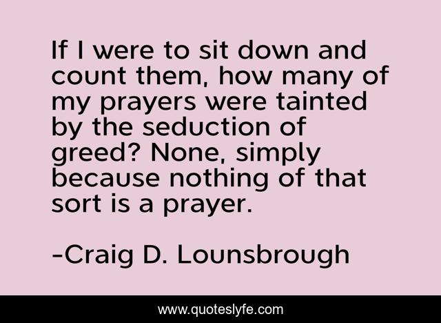 This page presents the quote "If I were to sit down and count them, how many of my prayers were tainted by the seduction of greed? None, simply because nothing of that sort is a prayer.". Author of this quote is Craig D. Lounsbrough. This quote is about prayers, contamination, tempted, praying, selfish, seduce, pray, god, self,.