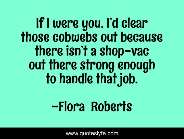 This page presents the quote "If I were you, I’d clear those cobwebs out because there isn’t a shop-vac out there strong enough to handle that job.". Author of this quote is Flora Roberts. This quote is about romance, erotica, flora-roberts, humor, falling-into-you,.