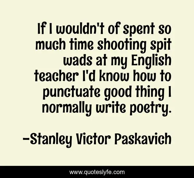 This page presents the quote "If I wouldn't of spent so much time shooting spit wads at my English teacher I'd know how to punctuate good thing I normally write poetry.". Author of this quote is Stanley Victor Paskavich. .