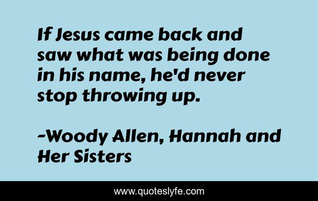 This page presents the quote "If Jesus came back and saw what was being done in his name, he'd never stop throwing up.". Author of this quote is Woody Allen, Hannah and Her Sisters. This quote is about organized-religion, christian-behavior, humor, woody-allen, religion,.
