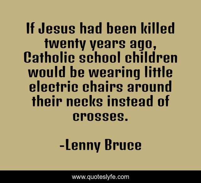 This page presents the quote "If Jesus had been killed twenty years ago, Catholic school children would be wearing little electric chairs around their necks instead of crosses.". Author of this quote is Lenny Bruce. This quote is about jesus-christ, rosaries, catholicism, christianity, electric-chairs, death-penalty, crucifixion, execution, anti-christian,.