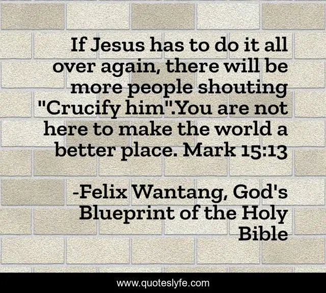 This page presents the quote "If Jesus has to do it all over again, there will be more people shouting "Crucify him".You are not here to make the world a better place. Mark 15:13". Author of this quote is Felix Wantang, God's Blueprint of the Holy Bible. This quote is about crucify, jesus-christ, heaven, god, make, better, holy-bible, shout, earth,.