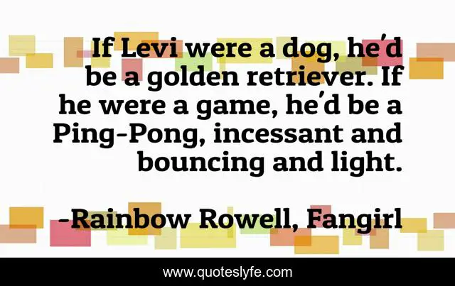 This page presents the quote "If Levi were a dog, he'd be a golden retriever. If he were a game, he'd be a Ping-Pong, incessant and bouncing and light.". Author of this quote is Rainbow Rowell, Fangirl. This quote is about rainbow-rowell, boys, boyfriends, fangirl,.
